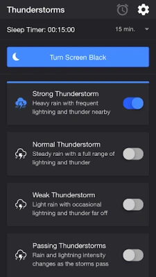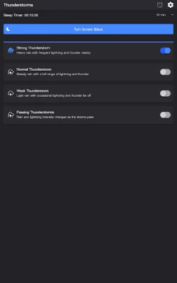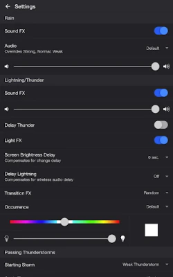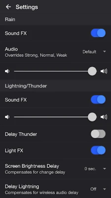 • Turn Screen Black adds a black overlay and sets your mobile device to the minimum brightness. Screen Brightness Delay setting compensates for the minimum to maximum brightness delay on some mobile devices. Set to .25-1 second if the screen lightning light effects do not reach peak brightness when lightning is the closest, i.e., thunder is the loudest.